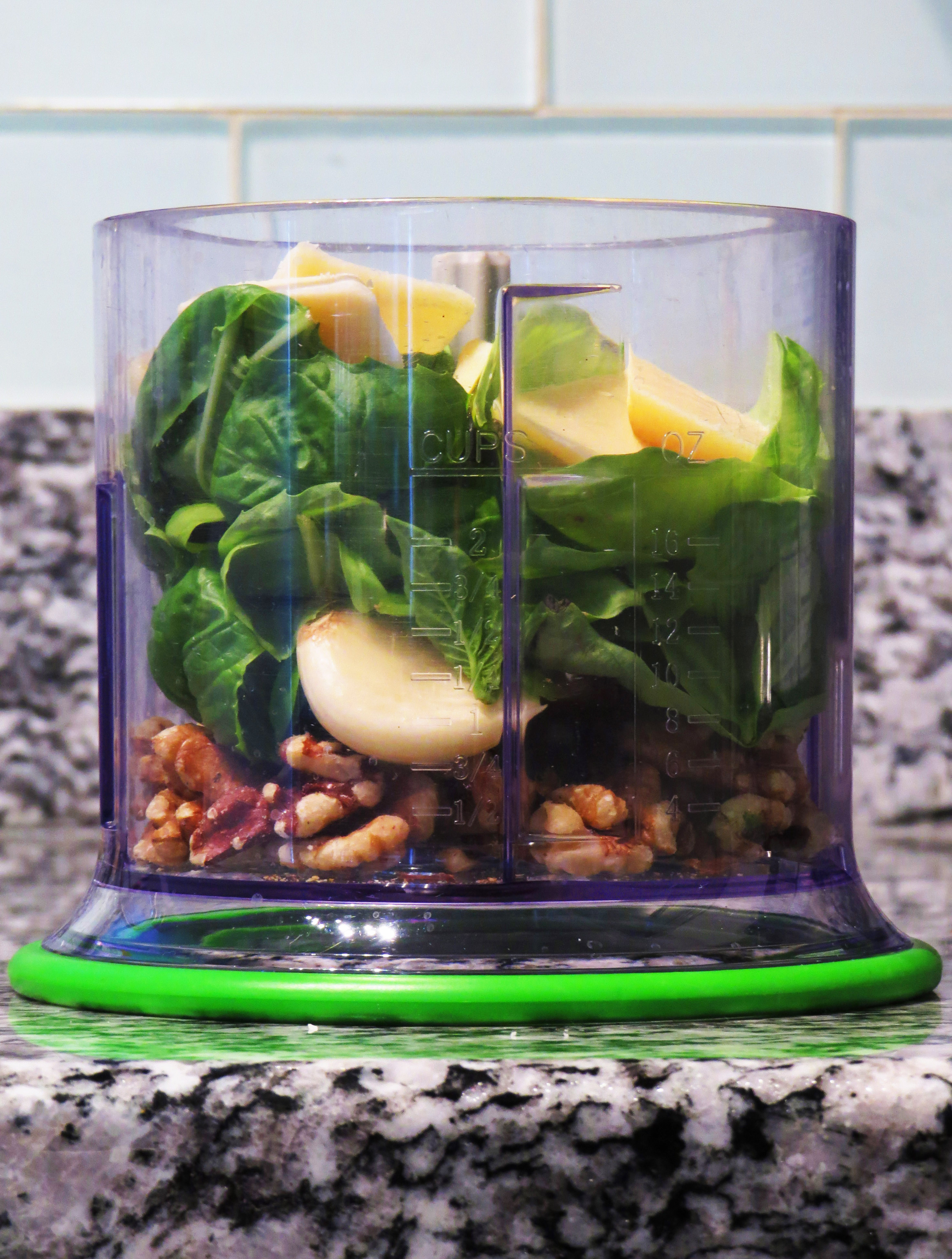 Heat a small frying pan over medium heat. Add the walnuts and toast until fragrant, about 2-3 minutes. Add walnuts, basil, spinach, garlic, Parmesan, and olive oil to the bowl of a food processor. Pulse until ingredients are incorporated and sauce reaches desired consistency. (I like mine pretty smooth.) Add salt and pepper to taste.