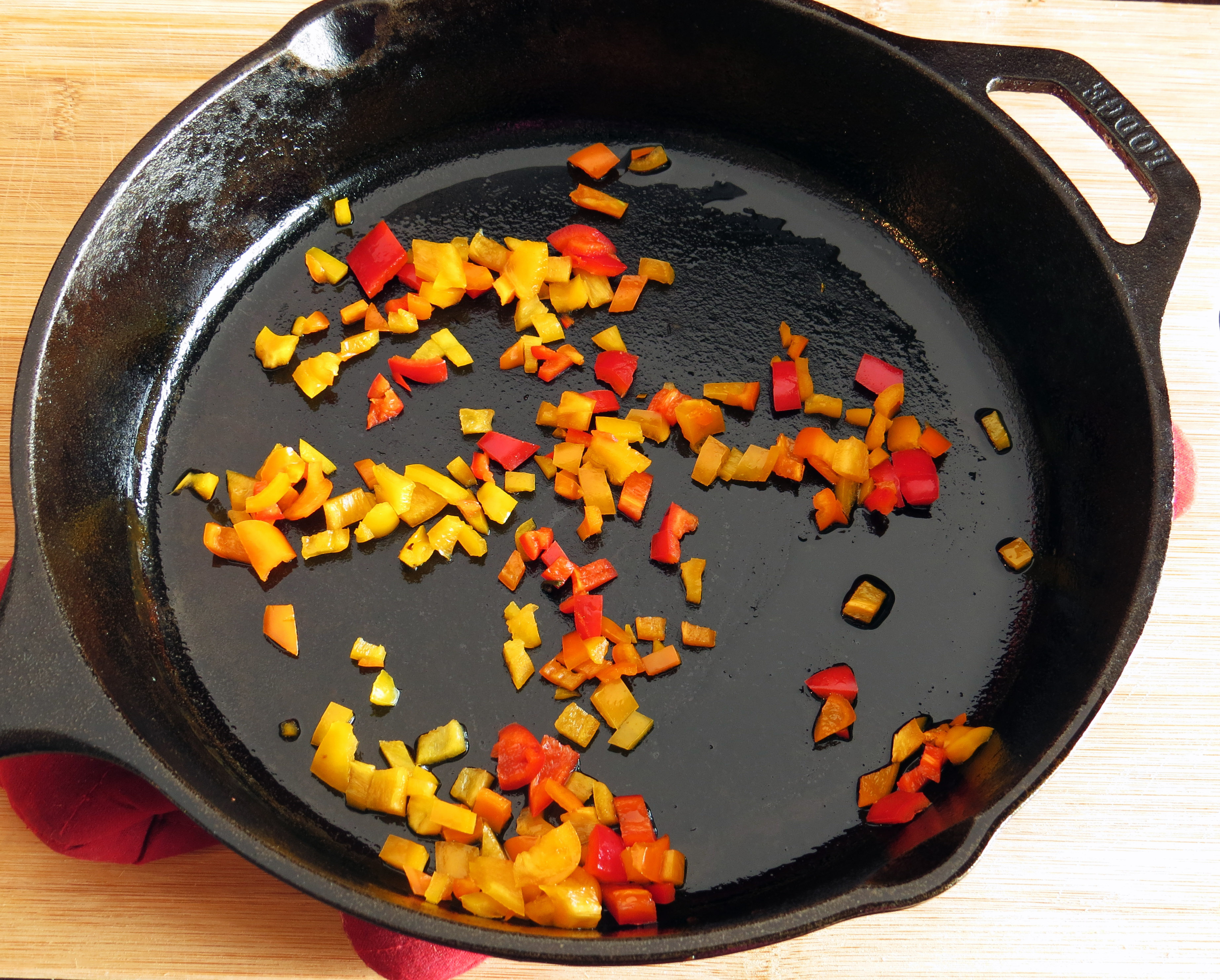 When the potatoes reach their final five minutes of baking, heat a 12-inch cast iron skillet (or another flat-sided, oven-safe pan) over medium heat. Add 1 tablespoon olive oil and diced vegetables; cook until vegetables soften slightly, 3-4 minutes. Remove from pan and reduce heat to low. Crack eggs into a medium bowl and whisk until thoroughly scrambled.